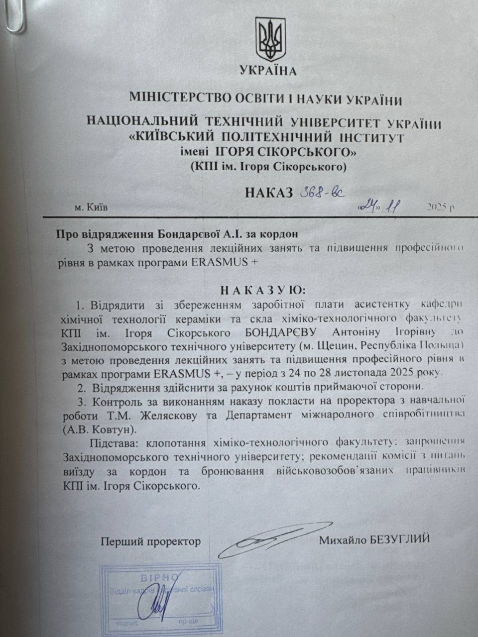- наказ про відрядження Бондаревої А.І. до Західнопоморського технологічного університету (Республіка Польща) та підтвердження